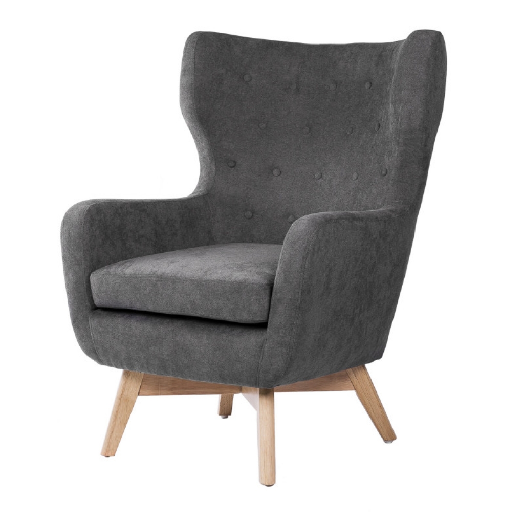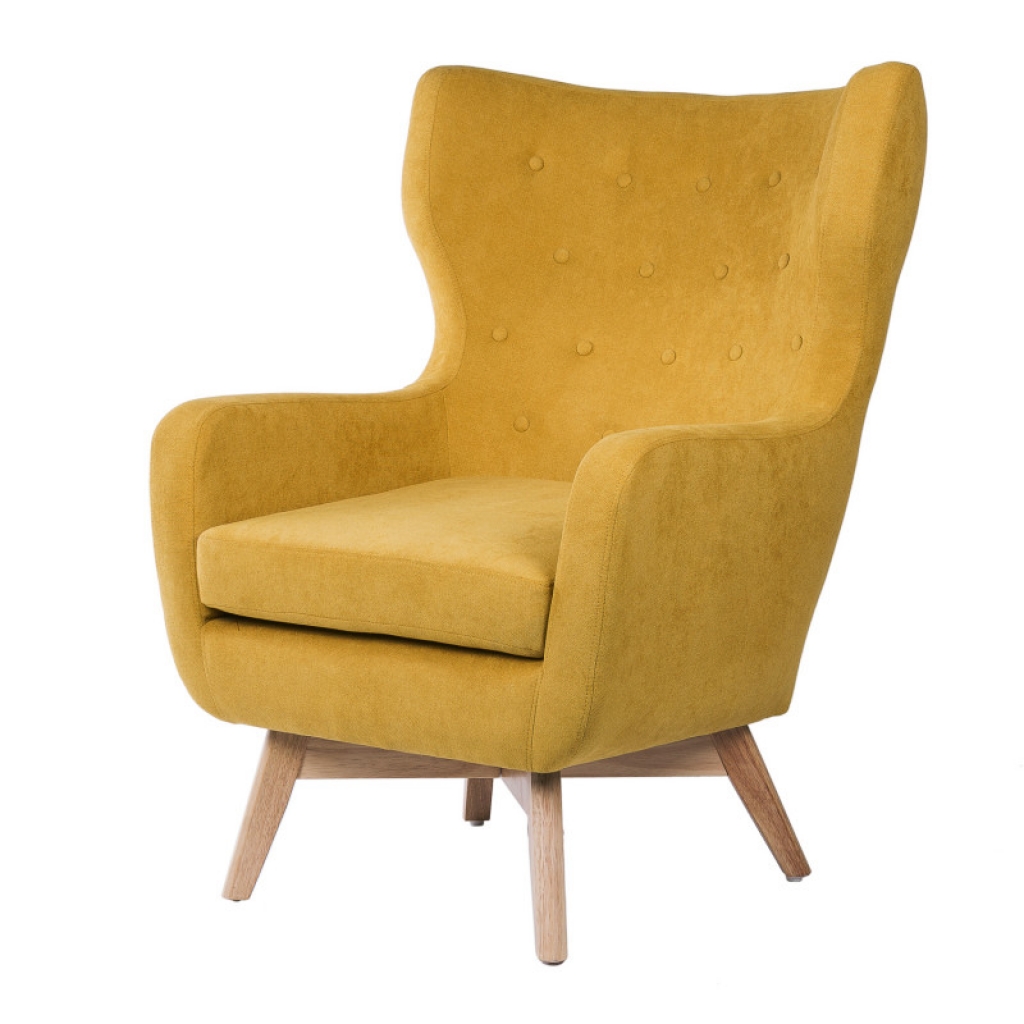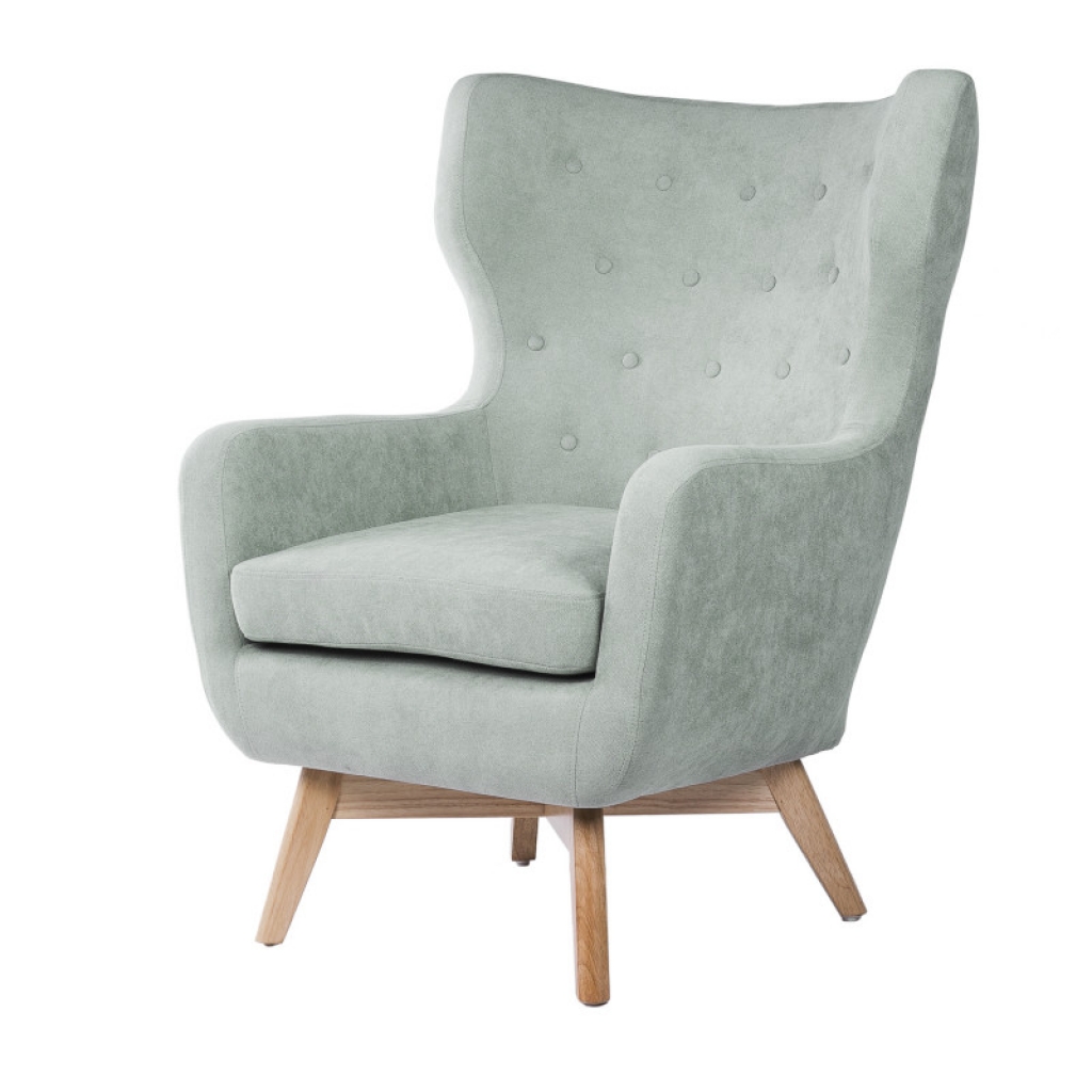 Butaca tapizada con patas de madera ligeramente inclinadas acabadas en color natural. Su respaldo con orejeras y con botones le dan un toque muy elegante. Esta butaca es ideal para momentos relax en cualquier estancia del hogar. Disponible en colores: Mostaza, gris oscuro, gris claro y verde menta