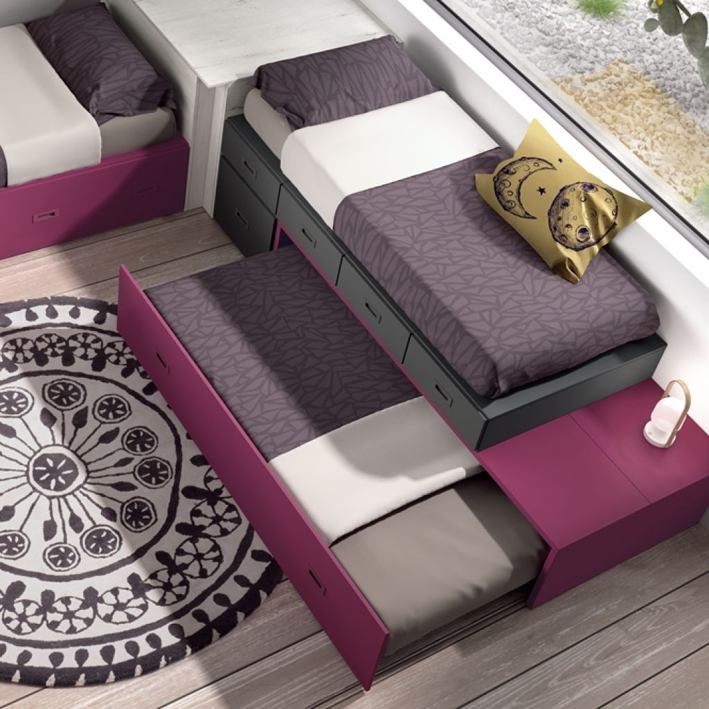 El dormitorio está acabado en melamina base Mozart, combinando módulos en Arándano y Teide. 2 camas de 90x190 montadas sobre módulos cube 1 cajón.