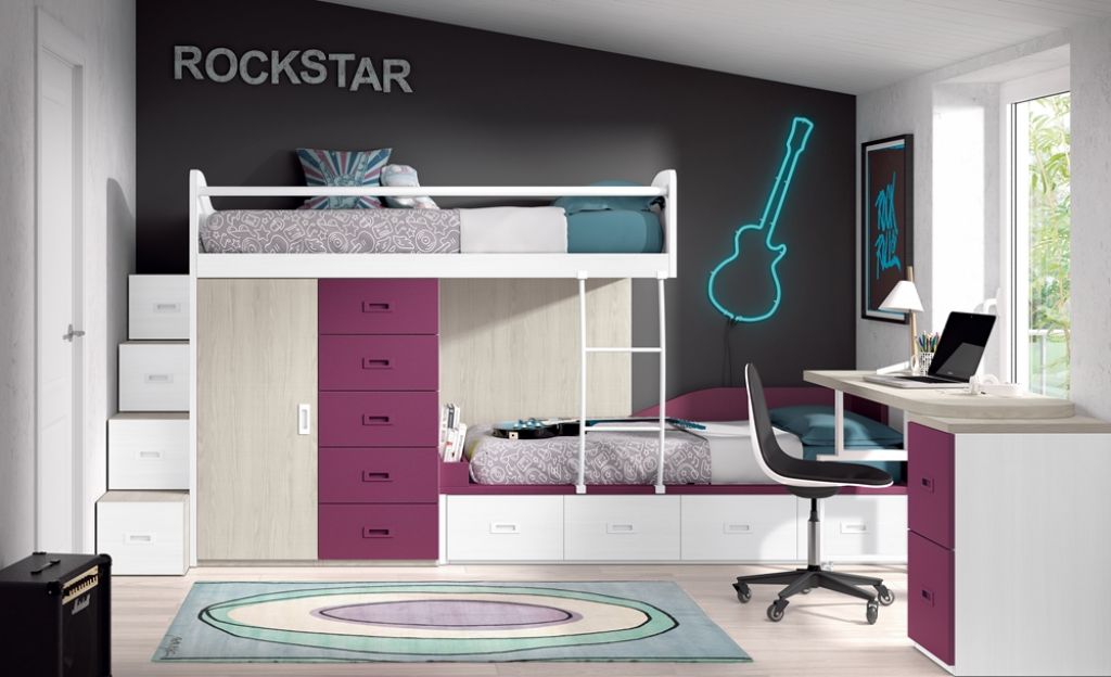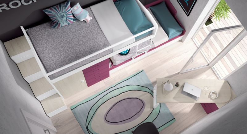 El dormitorio está acabado en melamina base Taiga, combinado con frontales en blanco porcelana y Arándano. 2 Camas Eco de 0.90x 1,90. Tirador empotrado Nieve y Arándano.