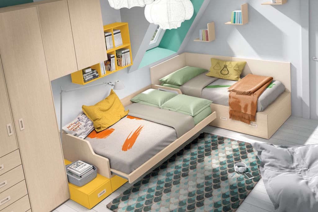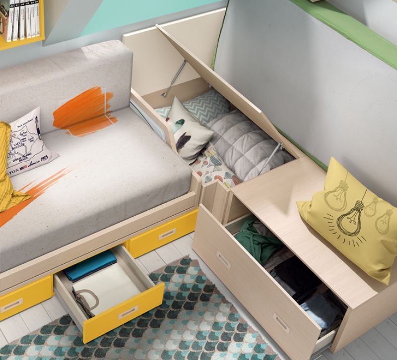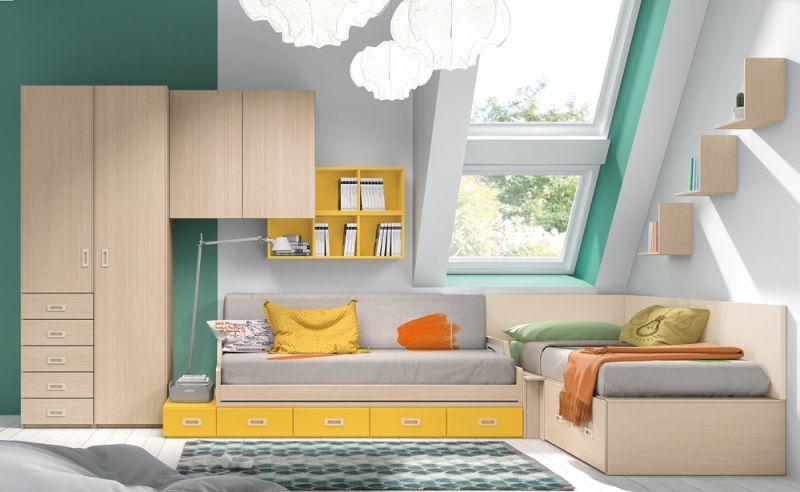 melamina base Roble, combinado con frontales en Lemon. Cama Evo de 1.20x 1,90 con colchón Evo. Cama de 90x190 sobre modulo cube y arcón cube abatible. Tirador empotrado Gobi.