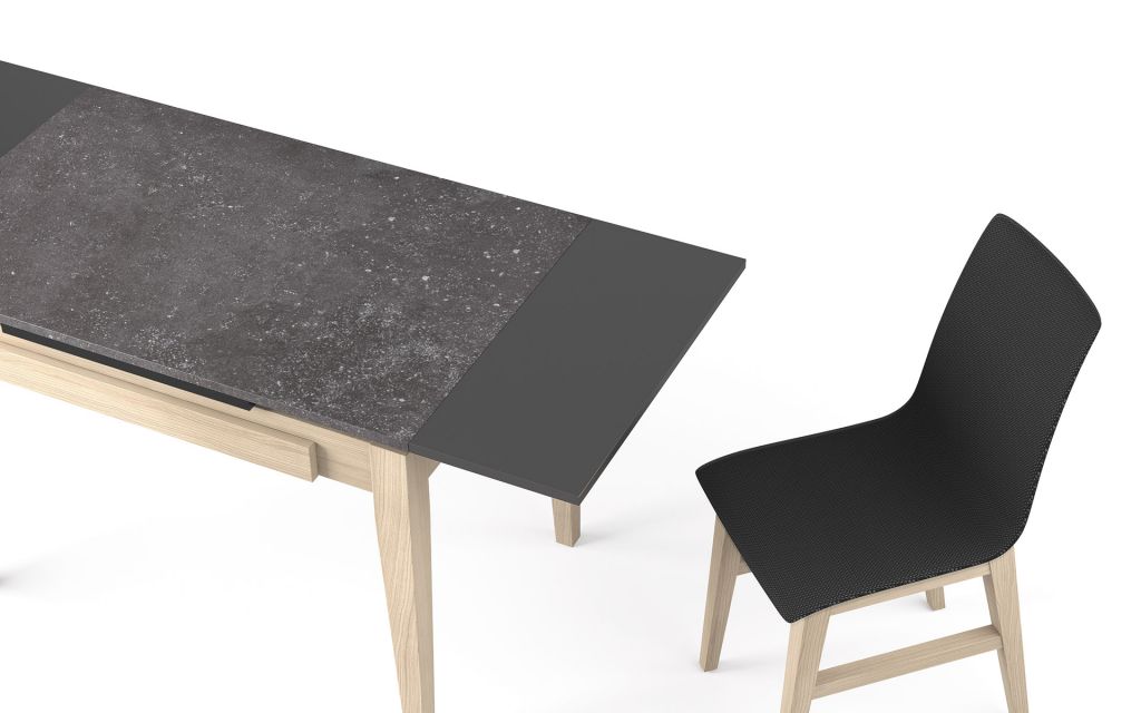 Madera de haya con cajón con encimera DEKTON FOSSIL 12 mm. pegada sobre tablero con canto de PVC. Extensiones en laminado con canto PVC. Guías automáticas. Patas en madera de haya piramidales de 60 a 35 mm.