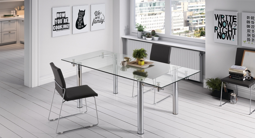 Mesa  T05 patas de hierro cromado sobre cristal de 10 mm templado con extensibles